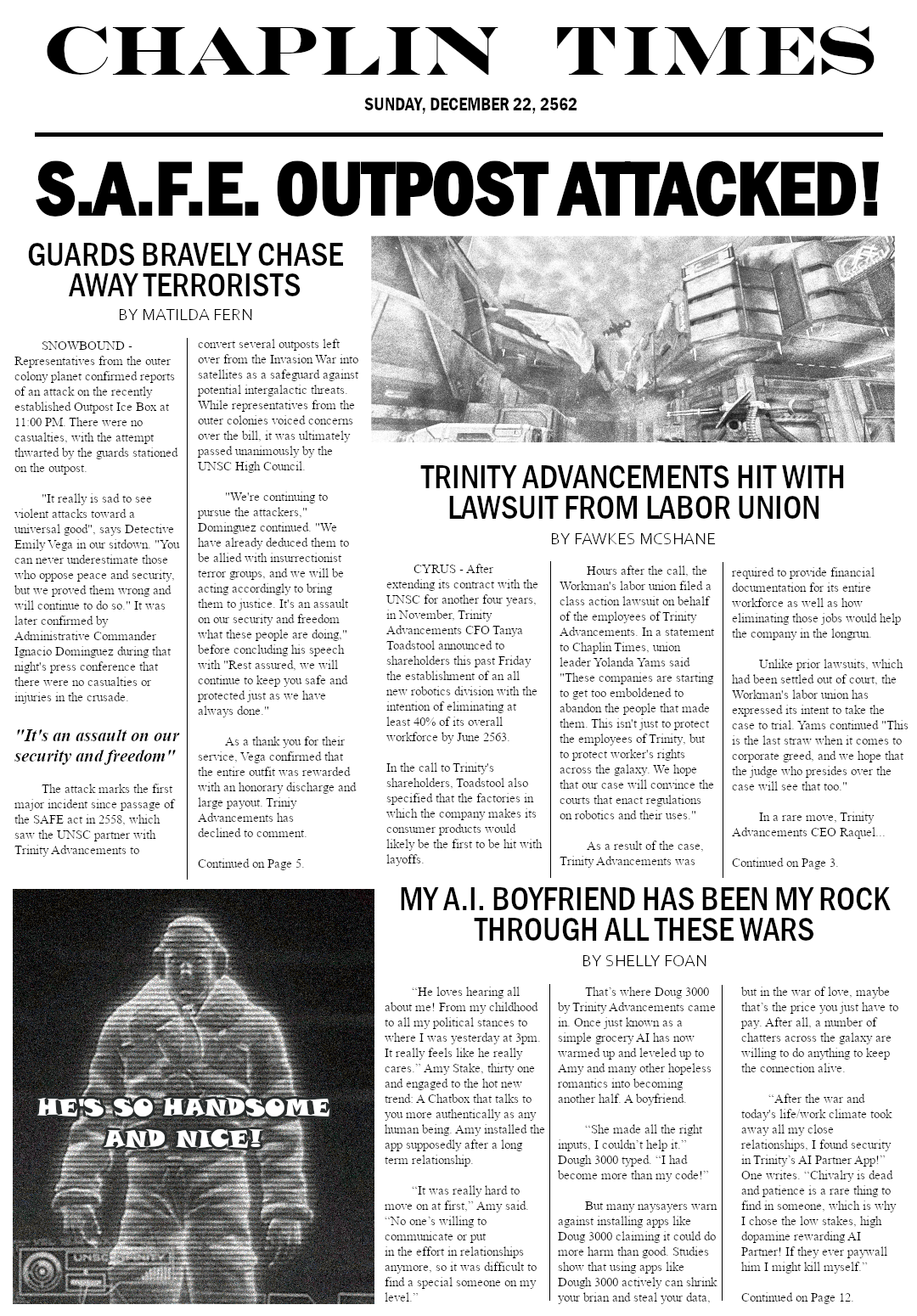 Chaplin Times is first mentioned in Bounty Wanted, when journalists Pidge Emmel and Fawkes McShane mention having left Chaplin Times after a corporate buyout from Trinity Advancements to start their Red Line podcast. Trinity's buyout of Chaplin is again mentioned by Pidge and Matilda Fern in OFF_THE_RECORD_DO_NOT_UPLOAD, where the pair also mention that Chaplin has been cancelling stories that could potnentially paint Trinity or SAFE in a negative light.